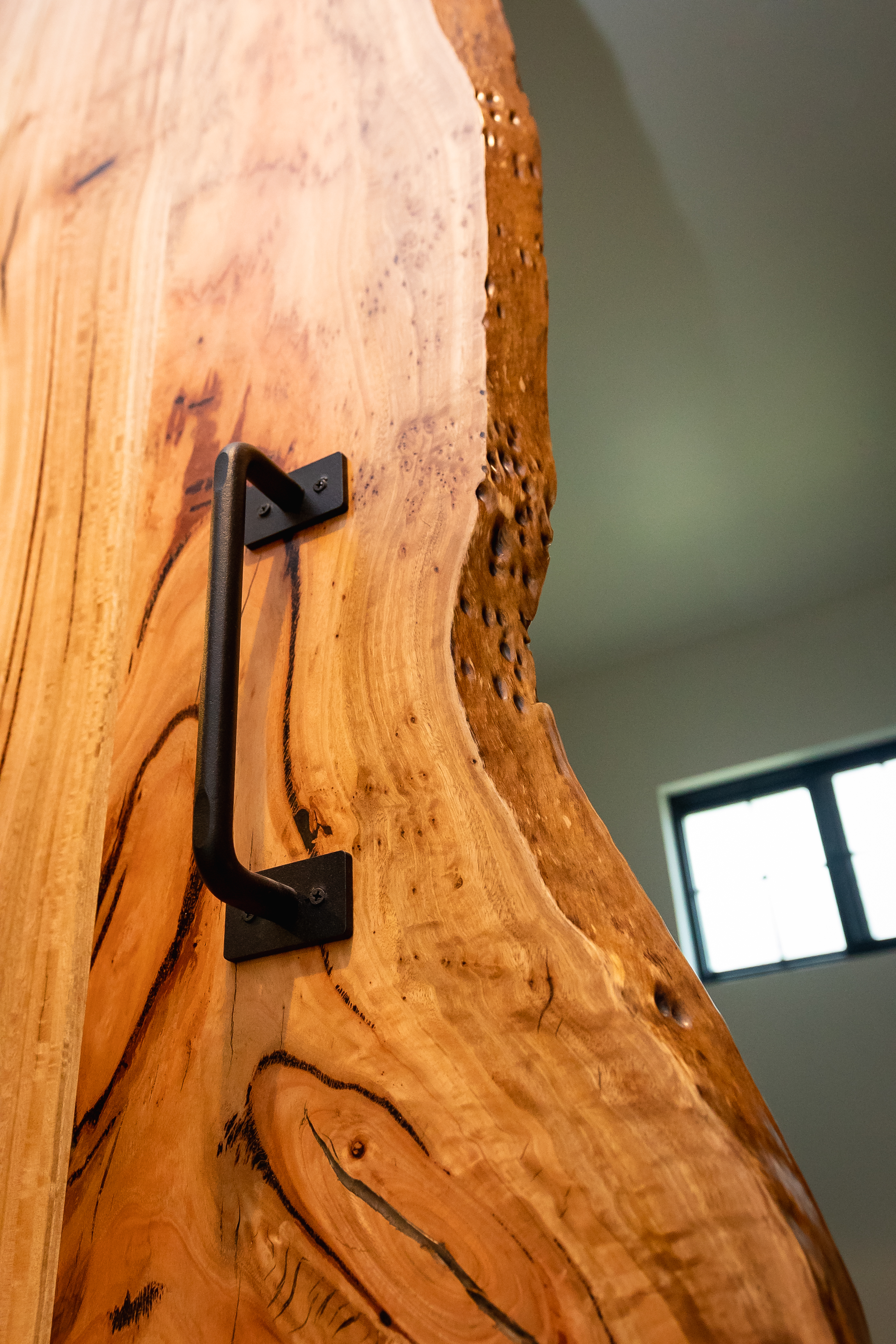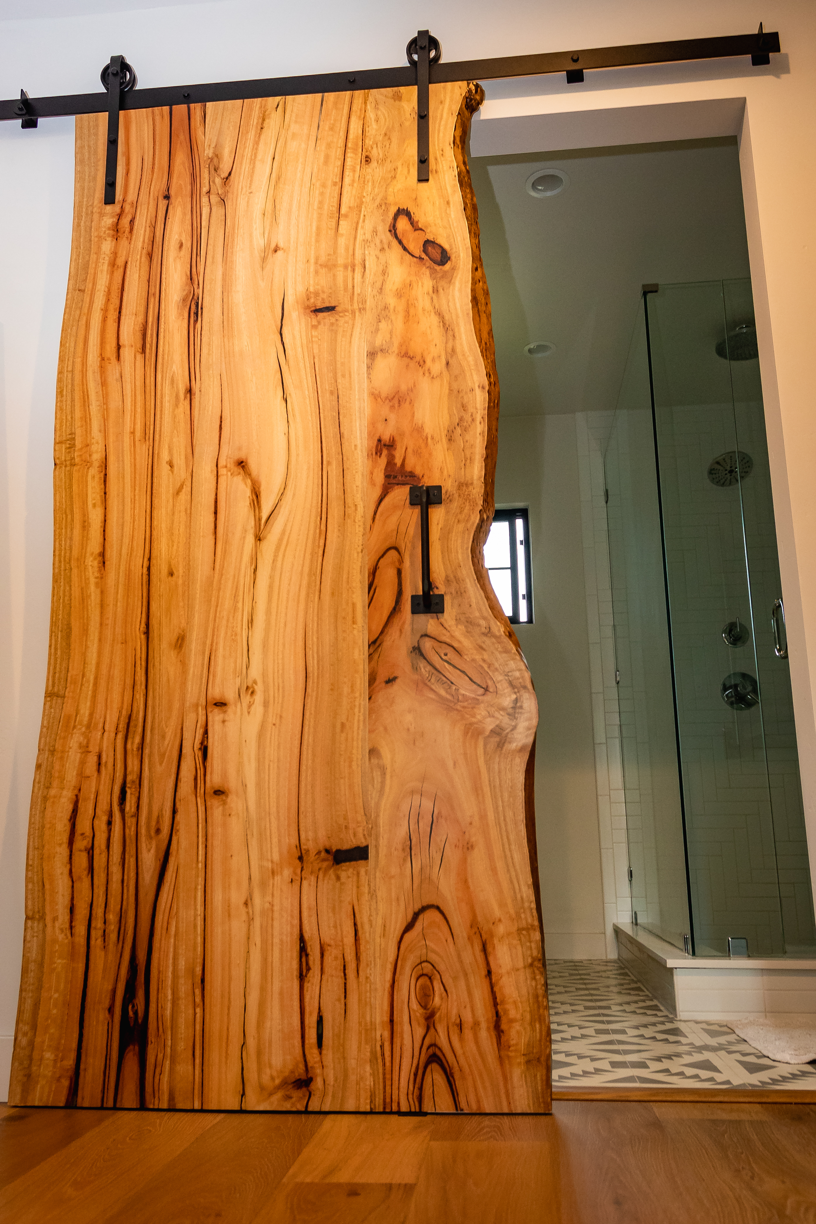 The master bathroom also has our signature custom milled Reclaimed live edge barn door.