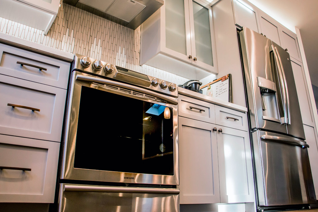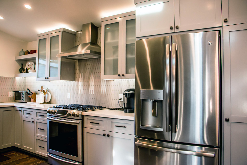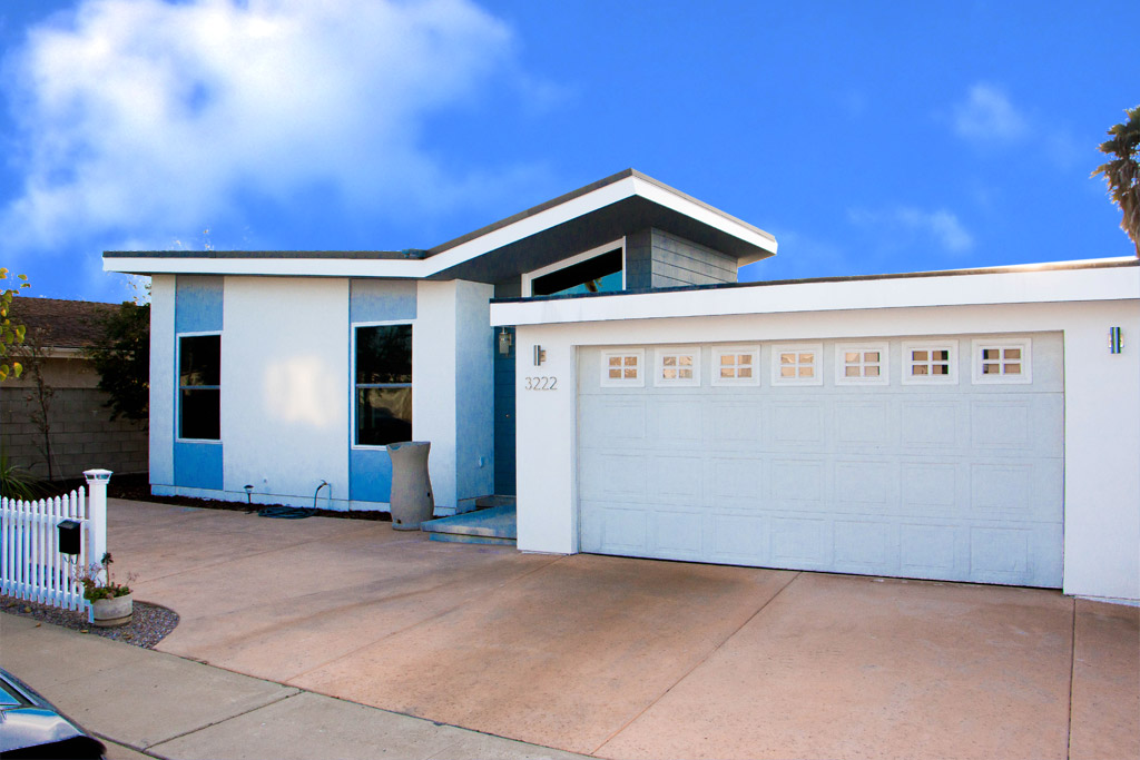 An addition and remodel project with master bedroom, master bath and complete interior upgrade. Look is urban contemporary, with Milguard windows and french doors. Acrylic smooth finish on stucco exterior with contemporary paint treatments and finishes. Striking Shaker style kitchen with quartz counter tops is the heart of the home. Achieved: more space, better utilization of existing space, style.