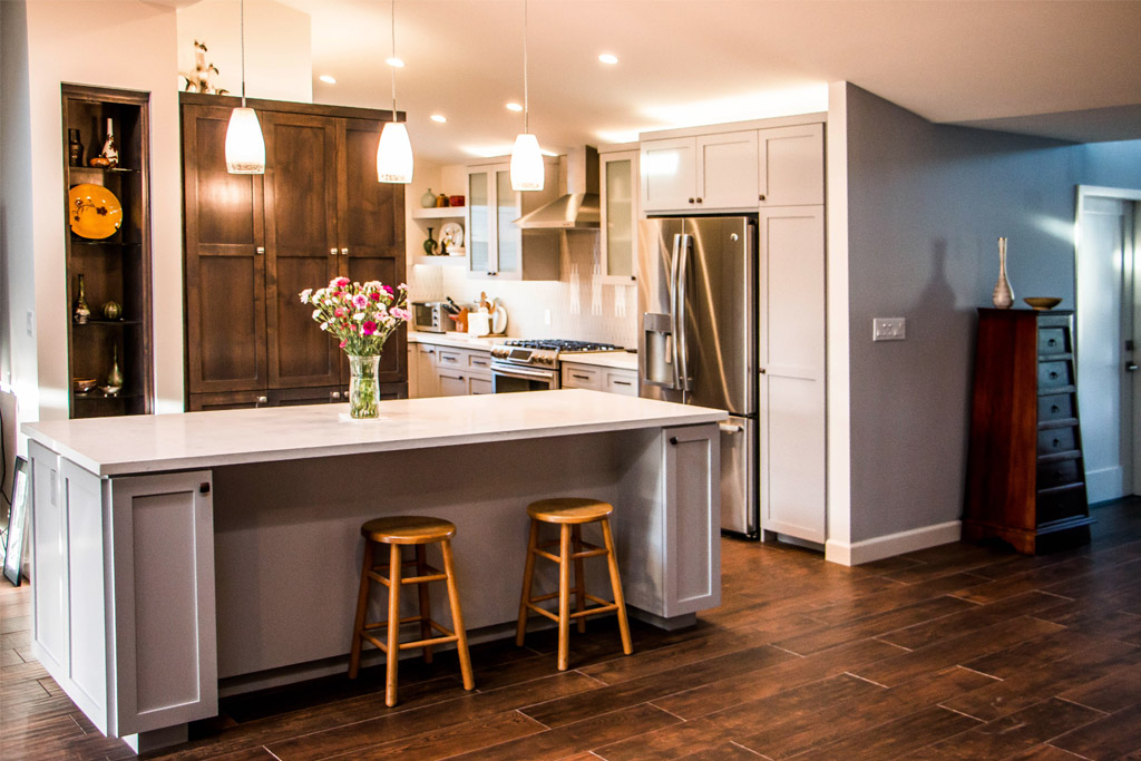 Project Features: Reclaimed wood island, full scale remodel, relocation of expanded master bath