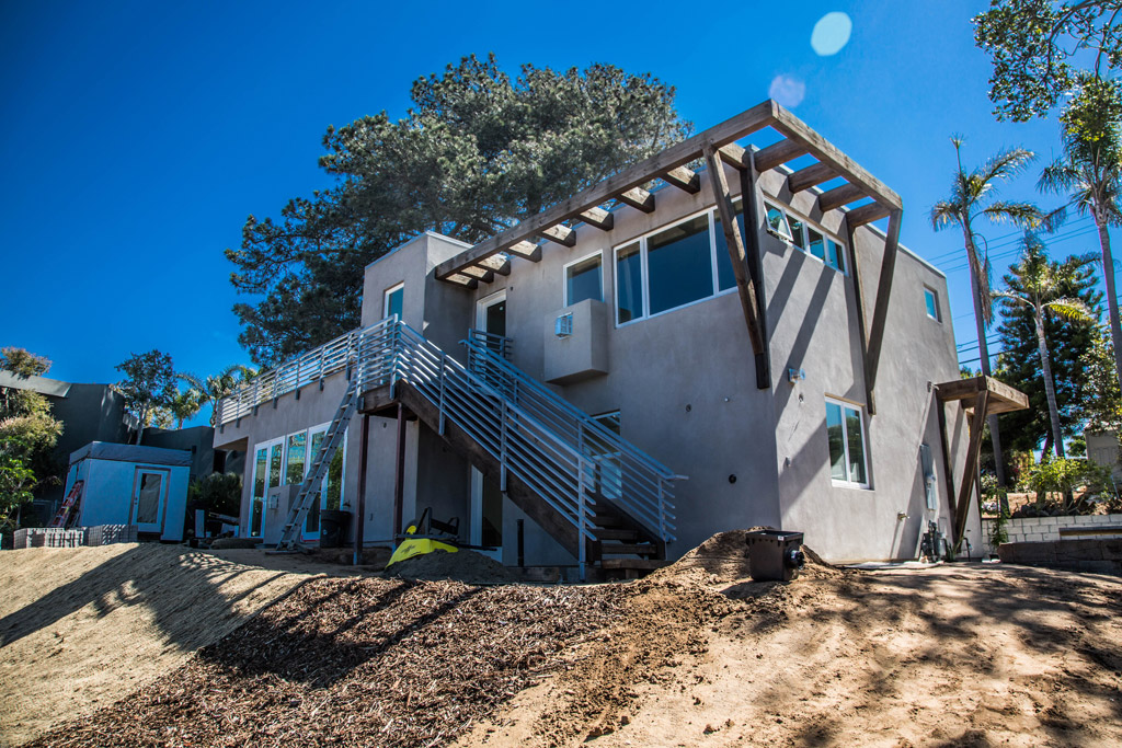 The challenge and opportunity in this residential remodel and addition was integration of old and new. Original house built 1930s is esthetically blended with contemporary new structure. This was necessary not only from an appearance standpoint but due to historic considerations. Milguard windows, smooth sand stucco finish, aluminum roll up garage door. All hardscape surfaces are water permeable. Standard West worked closely with the owner on design preferences as job progressed in this beautiful project.